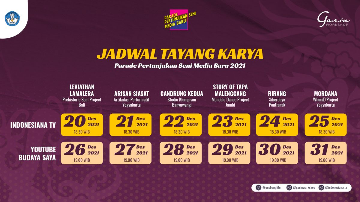 Enam (6) karya dari proposal terpilih tahun ini akan menemani liburan akhir tahun untuk tetap #bahagiadarirumah dengan ditayangkan perdana secara Exclusive Gelar Karya Parade Pertunjukan Seni Media Baru 2021 untuk tetap dapat #nontondirumah melalui Kanal Budaya Indonesiana TV pada tanggal 20 – 25 Desember 2021 dan tayangan ulang di Youtube Budaya Saya pada tanggal 26 – 31 Desember 2021, diantaranya :