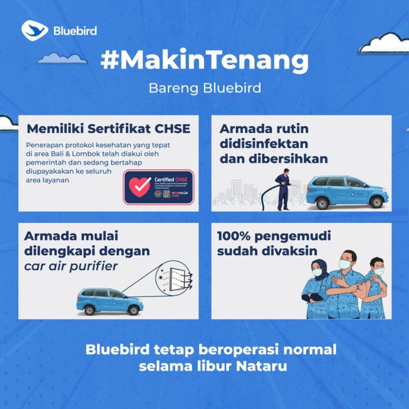 MediaPATRIOT – Jakarta, 30 Desember 2021 – Dalam rangka menyambut perayaan Natal dan Tahun Baru di tengah merebaknya Covid-19 varian Omicron di Indonesia, PT Blue Bird Tbk berbenah dengan melakukan penyegaran dalam implementasi protokol kesehatan di dalam armada. Penyegaran dalam implementasi protokol kesehatan Bluebird semakin diperkuat dengan keberhasilan Bluebird area Bali dan Lombok dalam memperoleh sertifikasi Clean, Health,Safety, and Environment Sustainability (CHSE) untuk wilayah Bali dan Lombok.