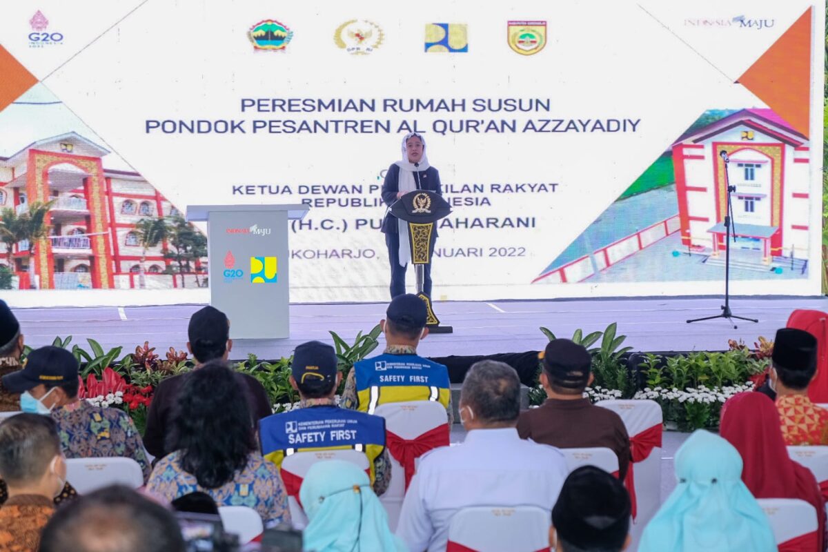 Didampingi Bupati Sukoharjo, Etik Suryani, Panglima Kodam (Pangdam) IV Diponegoro Mayjen Rudianto, sejumlah kepada daerah tingkat 2 di Jawa Tengah dan beberapa koleganya di DPR RI, Puan meresmikan gedung Rumah Susun (Rusun) Pondok Pesantren Al-Quran Azzayadiy, Sanggrahan, Kabupaten Sukoharjo, Jawa Tengah.