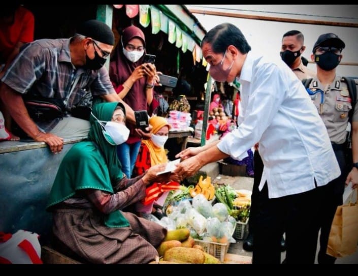 “Saya datang ke sini, tampak begitu hidup saat saya berkunjung, siang ini. Kepada para pedagang kaki lima dan warung yang saya temui di pasar itu, saya membagikan bantuan langsung tunai sebesar Rp1,2 juta per orang,” ujar Presiden Jokowi.