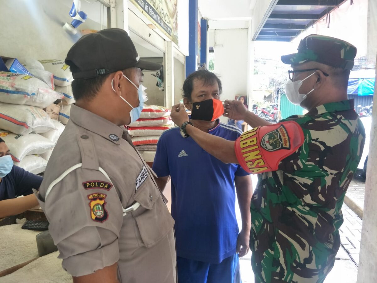 Terlihat di lokasi Serka Rudy sedang didampingi Security Pasar Karbella membagi masker kepada warga yang tidak menggunakan masker saat beraktivas di Pasar Karbella. Selain membagikan masker Serka Rudy juga menyampaikan himbauan protokol kesehatan.