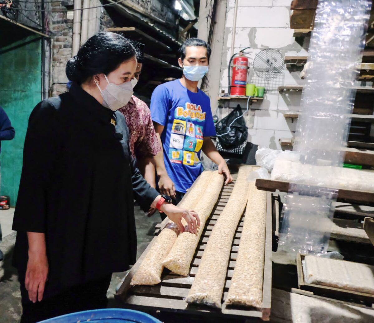 Puan berjalan kaki sekitar 100 meter di lorong permukiman warga untuk mengecek produksi di Kampung Sukomanunggal yang memasok tempe di kota Surabaya dan sekitarnya. Ia juga berdialog dengan para pengrajin yang mengeluhkan kenaikan harga kedelai sehingga berdampak terhadap produksi tempe tahu.