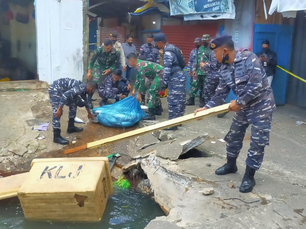 MediaPATRIOT – TNI AL, Komandan Denma Pangkalan Utama TNI Angkatan Laut IV (Dandenma Lantamal IV) Letkol Marinir Bob Tamara P.S., S.IP memimpin Tim Satgas Bencana Lantamal IV melaksanakan evakuasi korban robohnya Pelantar Pasar Baru II (Pasar Ikan KUD) di Jl. Pelantar KUD, Kota Tanjungpinang, Provinsi Kepulauan Riau, Sabtu (05/03/2022).