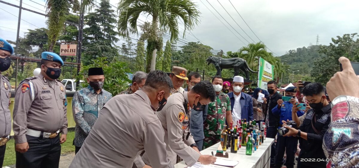 SUKABUMI,MPI- Ribuan botol Minuman Keras (Miras)baik yang bermerek maupun tradisional dimusnakan jajaran Polres Sukabumi bertempat di lapangan Apel Markas Polres Sukabumi, Jumat (01/04/22).