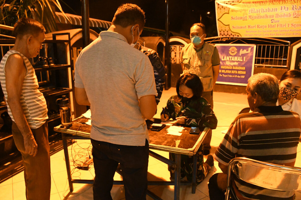 MEDIAPATRIOT.CO.ID – Belawan,- Beragam cara dilakukan oleh Pangkalan Utama TNI Angkatan Laut I (Lantamal) dalam menggenjot vaksinasi, agar herd immunity bisa segera tercapai, dengan memanfaatkan momentum bulan Ramadhan 1443 Hijriah, tenaga kesehatan Dinas Kesehatan (Diskes) Lantamal I menggencarkan serbuan vaksinasi covid-19 di Mesjid Kampung Salam, Medan Belawan pada malam hari baik sebelum maupun setelah pelaksanaan Sholat Tarawih, Rabu (06/04/2022).