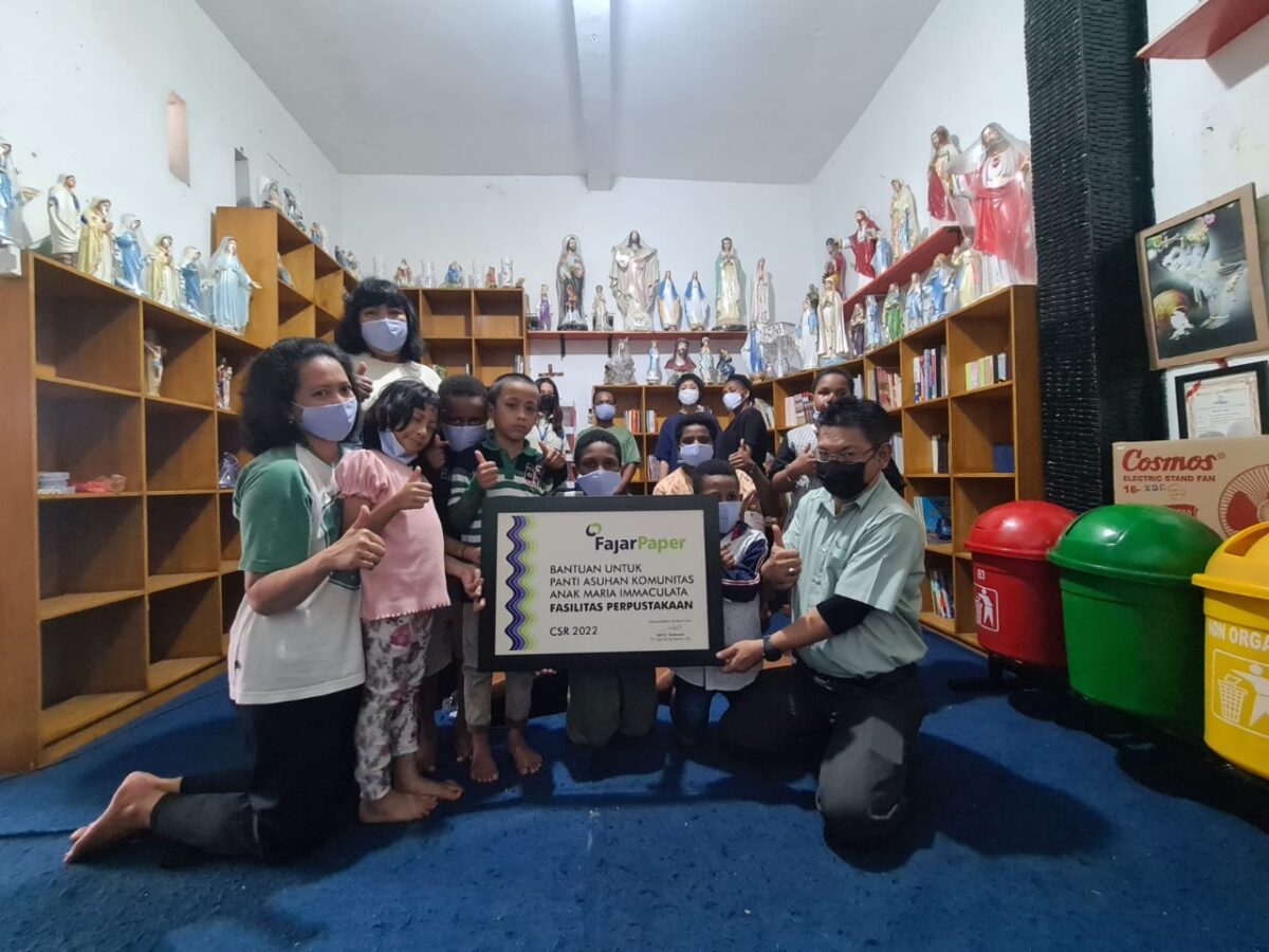 Bekasi, 07 April 2022 – PT Fajar Surya Wisesa Tbk (FajarPaper), produsen kertas kemasan terkemuka di Indonesia, memberikan fasilitas perpustakaan kepada panti asuhan disekitar perusahaan yang berupa buku-buku (buku pelajaran, agama, cerita, novel dan sebagainya), lemari buku, kipas angin, AC, meja, kursi, peta dunia dan Indonesia, papan tulis, alat tulis dan juga tempat sampah.