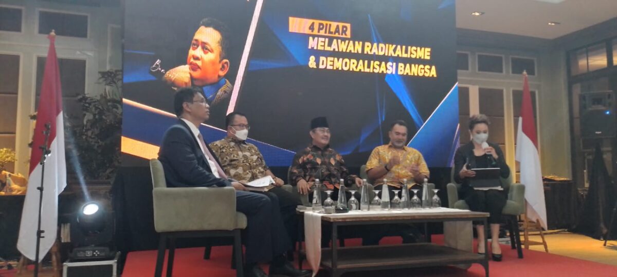 “Tekanan dan beban kehidupan yang semakin sulit juga berpotensi mendorong tumbuh suburnya radikalisme sebagai solusi instan dan pelarian dari berbagai himpitan persoalan. Di samping itu, fakta sosiologis bahwa kita ditakdirkan menjadi sebuah bangsa dengan tingkat heterogenitas yang tinggi, menjadikan kita berada dalam posisi rentan dari ancaman potensi konflik. Karenanya, MPR RI gencar melaksanakan vaksinasi ideologi berupa Sosialisasi Empat Pilar MPR RI ke berbagai kalangan masyarakat guna memperkuat imun ideologi setiap anak bangsa dalam menghadapi berbagai gempuran ideologi yang tak sejalan dengan jati diri bangsa Indonesia,” pungkas Bamsoet.
