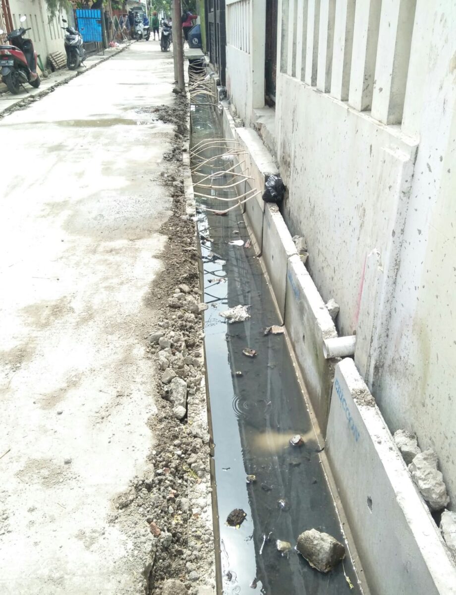 Pekerjaan konstruksi pembangunan saluran air di RW 015 Kelurahan Semper Barat Kecamatan Cilincing Jakarta Utara yang dikerjakan oleh Suku Dinas Air Jakut terlihat amburadul.
