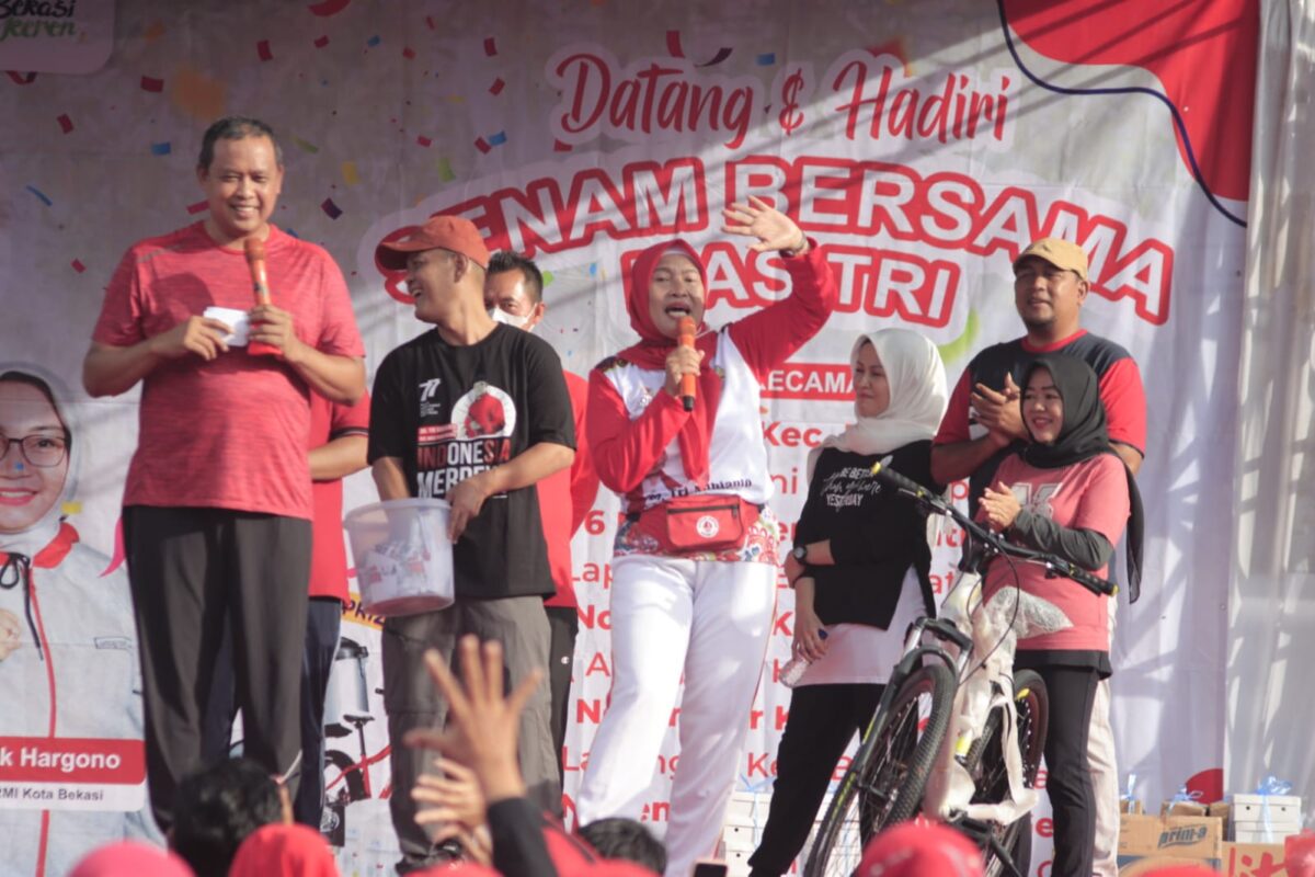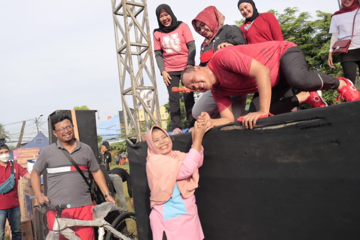 Usai melakukan senam, Tri Adhianto bersama Wiwiek Hargono berbagi kebahagiaan dengan membuka kupon undian, dan membagikan sepeda sebagai hadiah utamanya.