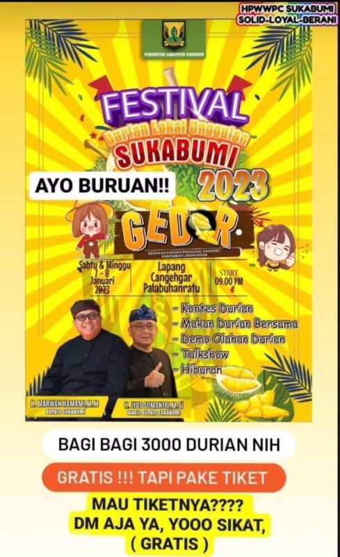 “Sesuai perintah pak Bupati (Marwan Hamami), Festival Durian Lokal Sukabumi ini harus menjadi agenda rutin di Kabupaten Sukabumi, untuk mengangkat potensi hortikultura daerah, terutama buah Durian dan para petani durian lokal di Kabupaten Sukabumi,”jelasnya.