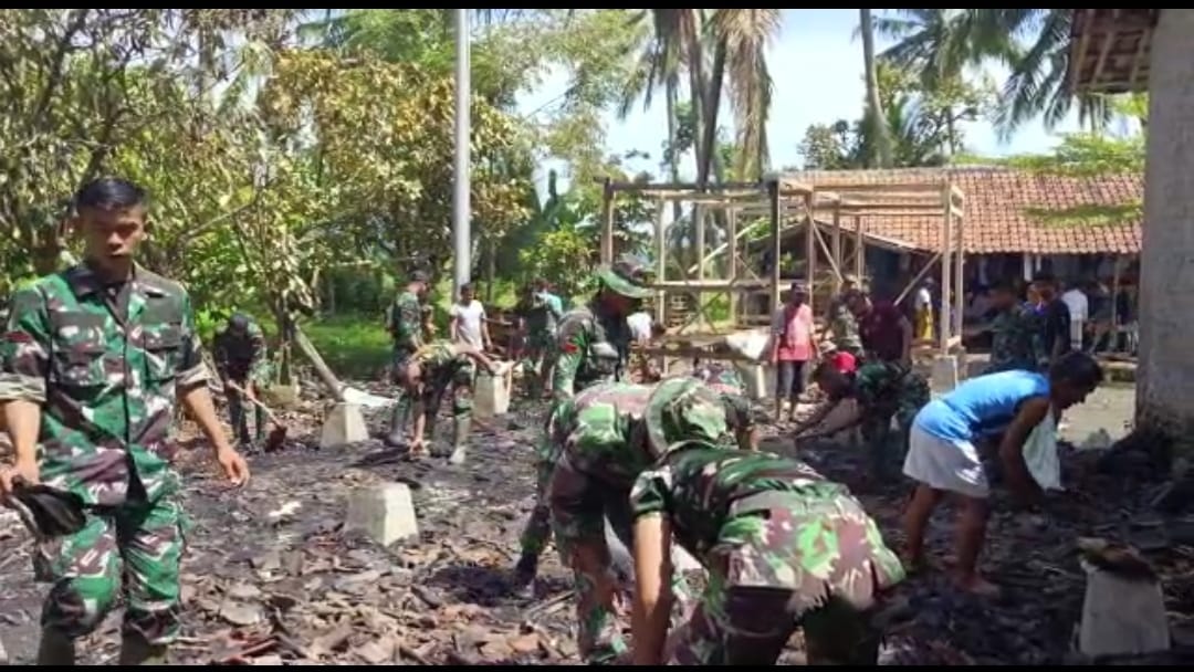 Serang, – Anggota Koramil 0602-13/Padarincang Kodim 0602/Serang dan Satgas Lat Terpur Yonif 310/KK bersama warga masyarakat serta para santri, bersanding bahu membersihkan puing-puing kebakaran pasca insiden kebakaran Pondok Pesantren Dodidoweren di Desa Batu Kuwung Kecamatan Padarincang Kabupaten Serang Provinsi Banten, Sabtu (14/01/2023).