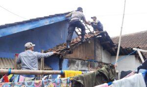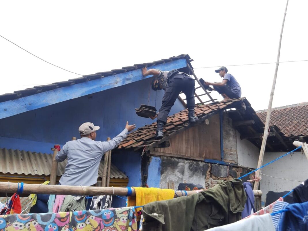 Bhabinkamtibmas Polsek Cimanggung Polres Sumedang Bripka Ekih Mintara yang dibantu warga membereskan beberapa rumah warga yang rusak ringan akibat tersapu angin puting beliung.