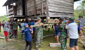 Kalimantan Utara, – Satgas Pamtas Yonarmed 5/105 Tarik/PG bersama masyarakat memindahkan Lumbung Padi milik gereja GKII di Desa Long Kiwan, Kecamatan Krayan Tengah, Kab. Nunukan, Kalut, Selasa (07/02/2023).