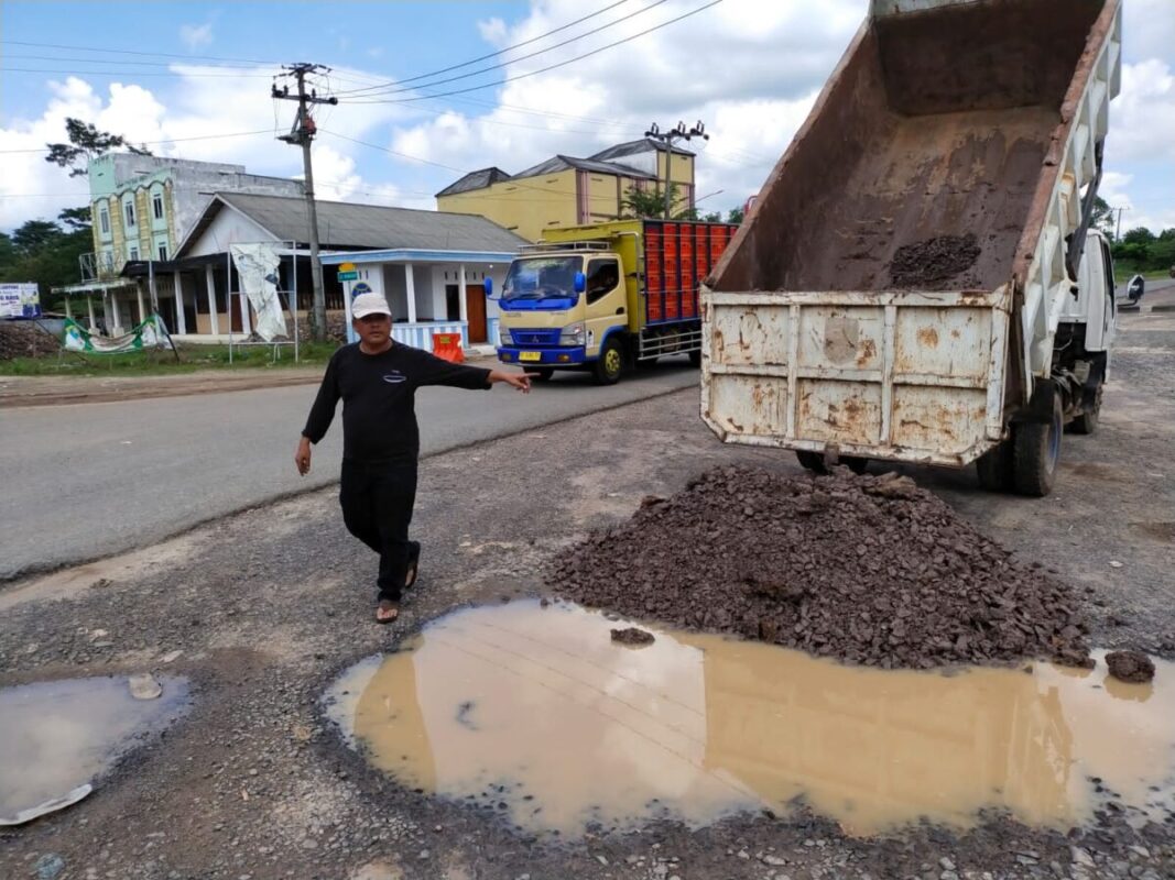 Pelaksanaan penimbunan Jalan berlubang dan yang mengalami kerusakan menggunakan material CSR dari PT.SIP sudah dilakukan beberapa hari yang lalu di beberapa titik ruas jalan yang mengalami kerusakan salah satunya di Perempatan Jalan Selamat Datang tepatnya di depan Pos Odol Dishub, Ujar endra
