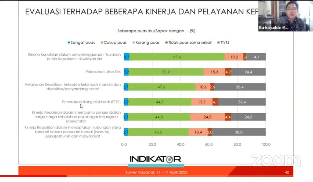 “Ada 71,5% masyarakat yang puas terkait kinerja Kepolisian membangun komunikasi dengan warga. Ada juga 73,6% yang puas dengan usaha Kepolisian memelihara keamanan dan ketertiban masyarakat,” ungkapnya.