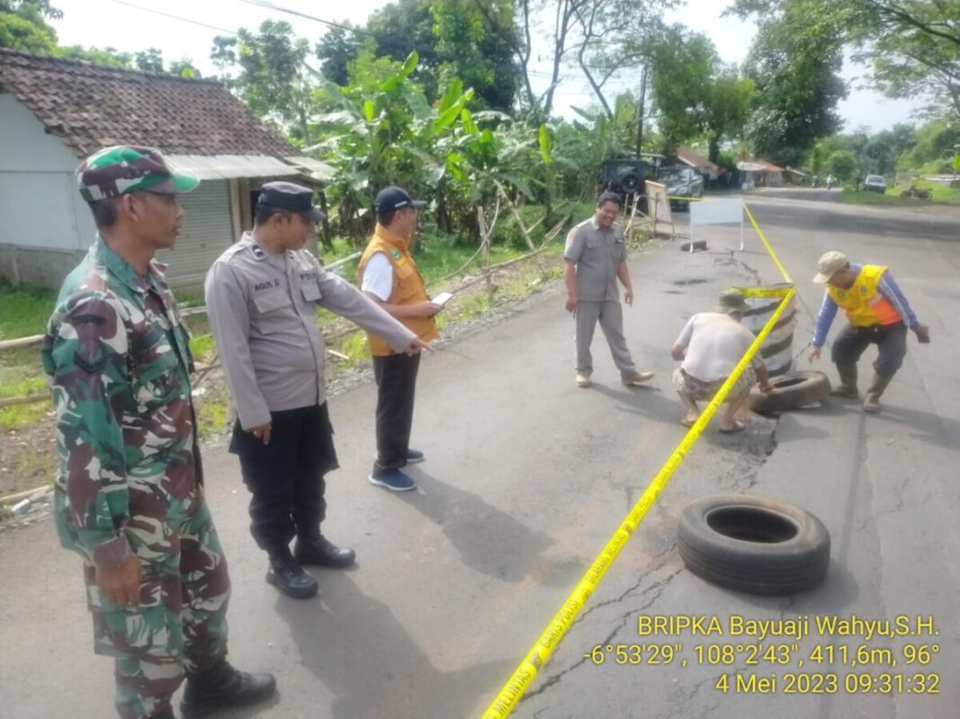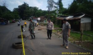Sumedang, Media Patriot – Kamisi, (04/5) 2023, Kapolsek Cisitu IPTU Agus Nurjaman, S.H. dan Anggota, melaksanakan Monitoring dan Pengamanan Lalu Lintas pada Lokasi Jalan yang Amblas di Jalur Tanjakan Eba Desa Cinangsi Kec. Cisitu Kab. Sumedang, yang disebabkan karena intensitas curah hujan yang cukup tinggi.