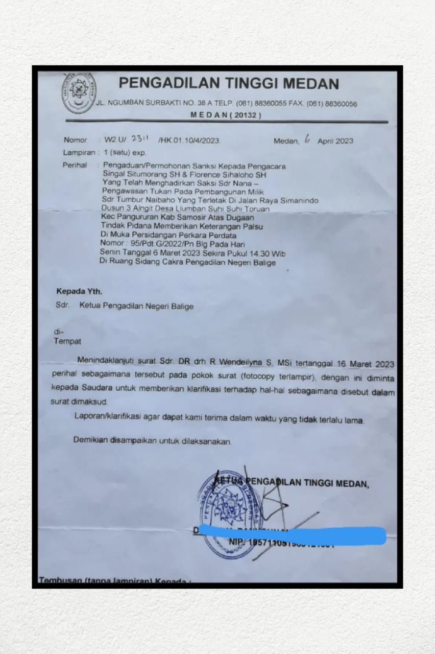 Samosir, mediapatriot.co.id – Terbitnya surat dari Polres Toba Nomor B/680/V/2023/Reskrim tanggal 16 Mei 2023 perihal permintaan wawancara atas laporan informasi memberikan keterangan palsu di Pengadilan Negeri Balige oleh saksi S Nainggolan warga Samosir dan Nana pengawas tukang pada pembangunan kantor parpol di Samosir dimana bangunan tersebut milik Tergugat I TN, telah diterima oleh pelapor.