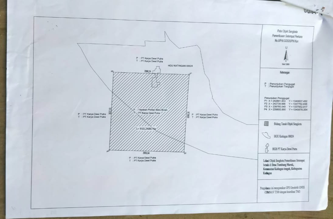 Y= 9842517.7295. Sangat di sayangkan 9 tahun kita melaporkan ternyata ketidak benaran data sehingga membuat kami Yayasan Kelompok Tani Batu tidak mendapatkan kepastian Hukum dari Polda Kalteng di karena data BPN Katingan terindikasi berkonspirasi dengan PT. KDP dan Greheng H. Lastri.