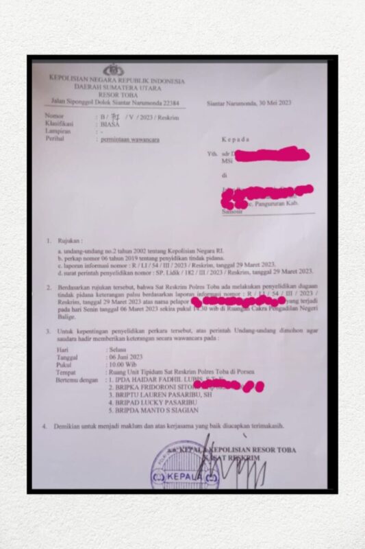 Samosir, mediapatriot.co.id – Setelah tertunda akibat beberapa hal, pelapor yang merupakan kuasa insidentil penggugat pada perkara perdata nomor 95 di Pengadilan Negeri Balige, yang telah melaporkan kepada Kapolres Toba yaitu saut nainggolan alias apa imel warga samosir dan nana pengawas tukang pada pembangunan kantor dpc gerindra kab samosir pada persidangan tanggal 6 maret 2023 lalu di pengadilan negeri balige, hadir memenuhi undangan kapolres toba nomor : B/717/v/2023/reskrim tanggal 30 mei 2023 perihal permintaan wawancara, pada jumat 9 juni 2023