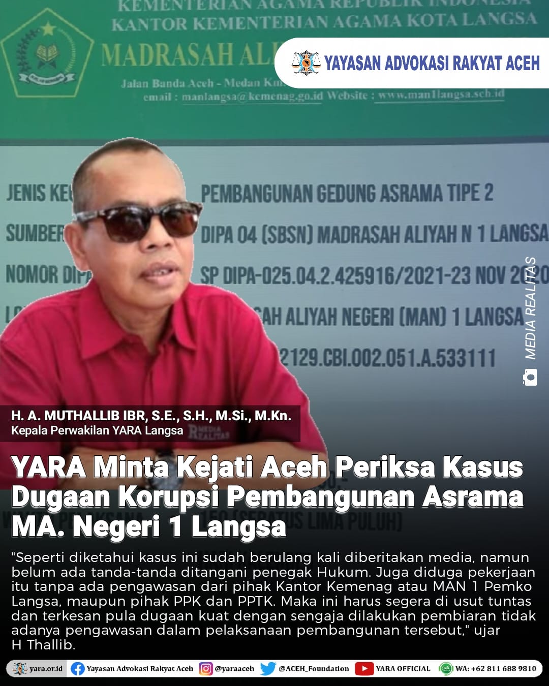 ACEH, MPI – Ketua yayasan advokasi rakyat aceh (YARA) perwakilan langsa, H A Muthallib, ibr, SE,.SH,.M.Si,.M.Kn, meminta kejati aceh. Agar segera di periksa kasus penggunaan madrasah aliah negeri (MAN) 1 langsa, yang diduga adanya indikasi korupsi.