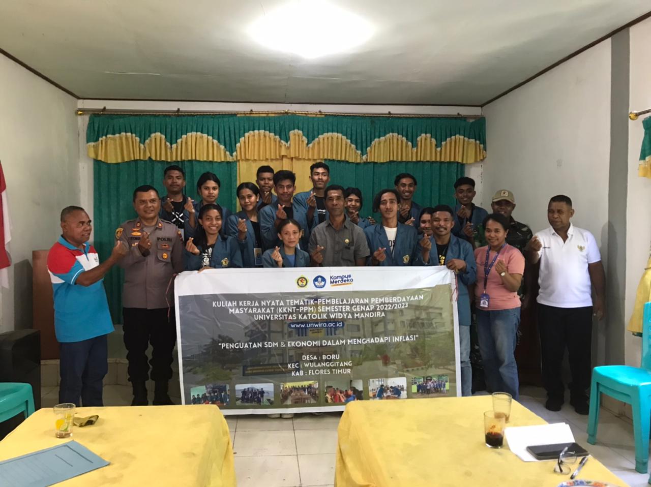 Sebanyak 14 orang mahasiswa dari Unwira Kupang ditempatkan di Desa Boru, Kecamatan Wulanggitang – Kabupaten Flores Timur. Bersama dengan dosen pendamping lapangan, Ibu Maria Aloisia U. Leba, M. Si, mereka disambut sangat sangat dan baik oleh Kepala Desa Boru – Bapak Alfonsus Klasa Soge. SE serta para aparat desa dan masyarakat desa setempat.