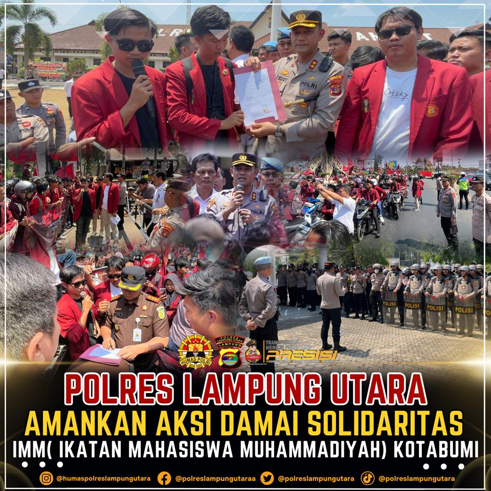 Polres Lampung Utara menerjunkan 125 personel dalam rangka pengamanan aksi damai soladiritas Rempang oleh Ikatan Mahasiswa Muhammadiyah (IMM) Kotabumi, Senin (25/9/23).