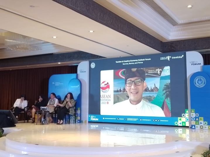 Sandiaga Salahuddin Uno sebagai Menteri Pariwasata dan Ekonomi Kreatif RI menyampaikan sambutan melalui video conference di Hotel Borobudur bahwa dirinya senang sekali hari ini di undang dalam virtual FGD Tourism & Creative Econony Outlook Forum. Saya ingin menyampaikan beberapa pandangan terkait para pelaku Parekraf. Dulu saya waktu di dunia usaha saya selalu di akhir tahun menyusun rencana bisnis / business plan untuk tahun 2024. Pemerintah harus hadir memberikan pandangan, kita melihat di situasi global ini penuh tantangan. Geopolitik kemarin ada Rusia dan Ukraina, China dan Amerika dan sekarang ketegangan di timur tengah. Sehingga proyeksi pertumbuhan perekonomian di dunia ini ada di angka diperkirakan sekitar 3%. Indonesia diatas 5% sedikit dibawah pertumbuhan ekonomi India.