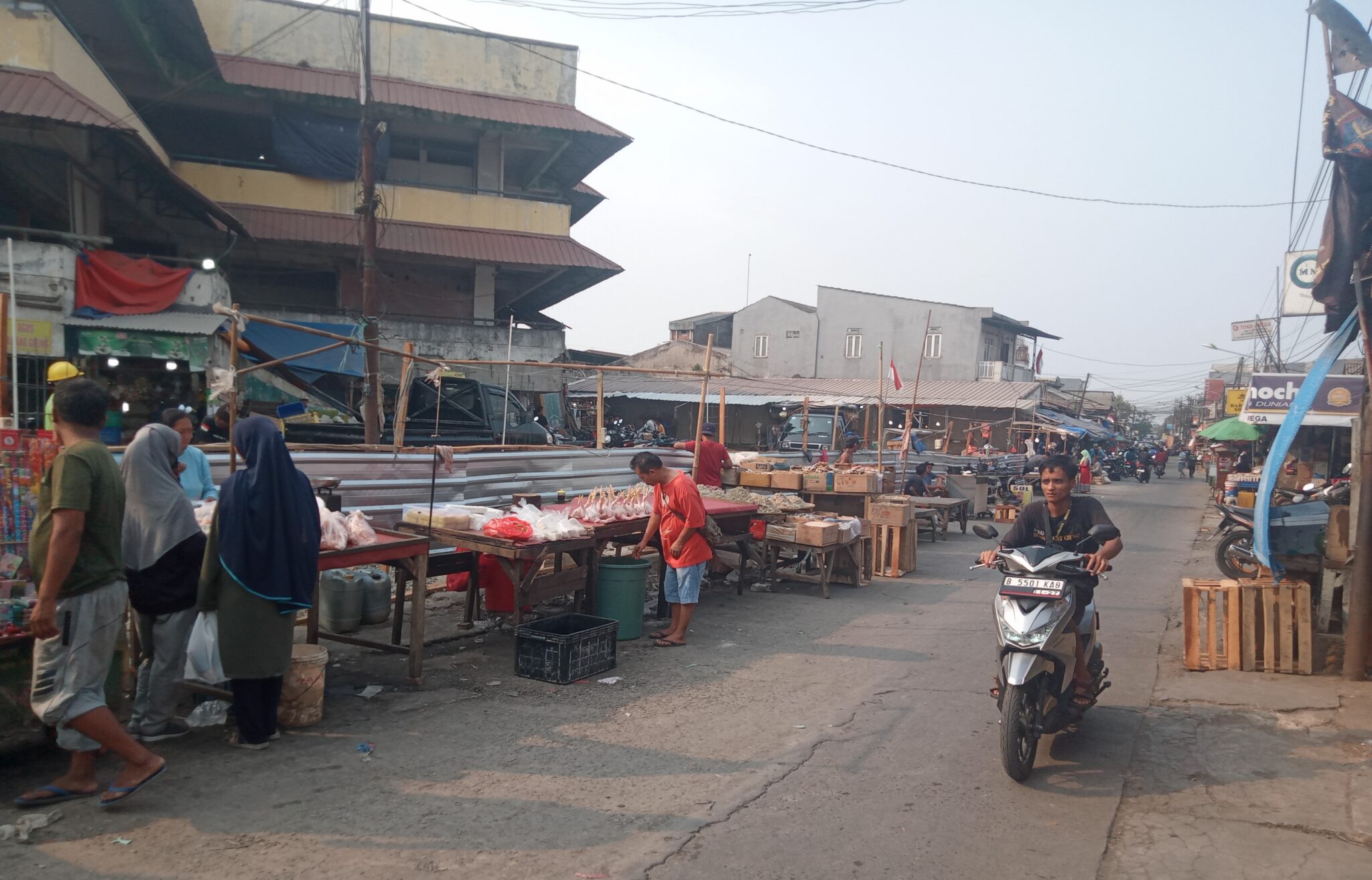 Baru sepekan dibersihkan, kini areal belakang Pasar Bantargebang kembali dipenuhi PKL. Para pedagang tetap menaruh lapak dagangan mereka meski harus berdempetan dengan pembatas yang dipasang pihak pengembang dengan menggunakan material seng.