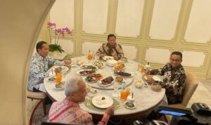 Jokowi dan ketiga bacapres makan siang di meja bundar di salah satu ruangan di Istana Merdeka. Di kanan Jokowi ada Ganjar, Prabowo di kiri Jokowi, sedangkan Anies di depan Jokowi.