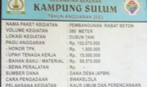 Sesuai plang papan nama anggaran dana, yang di tampilkan oleh pihak perangkat desa kampun sulum itu. Pada tahun anggaran dana 2023 ini, nama paket kegiatan. Pembangunan rabat beton, volume kegiatan. Tiga ratus delapan puluh (380) meter, lokasi kegiatan. Dusun tani, pagu anggaran. Rp.102.070.000,- honor tpk. Rp.1.500.000. Upah tenaga kerja, Rp.15.000.000.- Bahan baku/material, Rp.85.570.000.- Sewa peralatan, Rp. -, sumber dana. Dana desa (apbn), cara pengedaan. Swakelola, pelaksana kegiatan. Kaur umum dan perencana. Waktu pelaksanaan, 41 hari kerja.