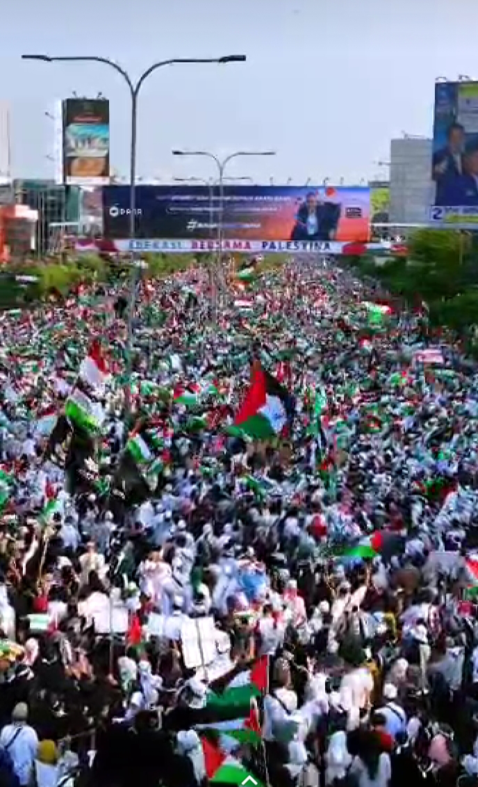 Puluhan ribu massa dari beebagai kalangan menggelar aksi bela Palestina di sepanjangJalan Ahmad Yani mulai dari simpang BCP hingga Fly Over Sumarecon. Dalam akai itu, massa terlihat kompak mengenakan baju serba hitam maupun serba putih dengan sejumlah atribut Palestina.