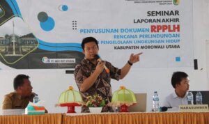 Morowali Utara, Mediapatriot.co.id – Bupati Morowali Utara Dr. dr. Delis Julkarson Hehi, MARS membuka kegiatan Seminar Laporan Akhir Penyusunan Dokumen Rencana Perlindungan dan Pengelolaan Lingkungan Hidup (RPPLH) Kabupaten Morowali Utara tahun 2023, bertempat di Aula Bappelitbangda, Senin (20/11/2023)