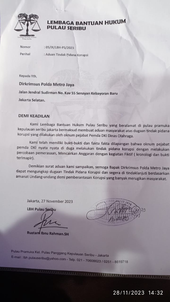 Jakarta,- mediapatriot.co.id Lembaga Bantuan Hukum (LBH) Pulau Seribu, telah melaporkan oknum pejabat Dispora Provinsi DKI Jakarta, selaku Pejabat Pembuat Komitmen (PPK), inisial (JMS) ke Dirkrimsus Polda Metro Jaya. Nomor Laporan: 05/IX/LBH-PS/2023. Perihal: Aduan Tindak Pidana Korupsi, atas nama