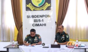 Danpomdam III/Siliwangi Kolonel Cpm Didin Sofyannadin menerima kunjungan kerja Komandan Satuan Penyidikan (Dansat Idik) Puspomad Brigjen TNI M. Yusrif Guntur, S.Sos., M. Si., ke Subdenpom III/5-1 Cimahi, Kamis (30/11).