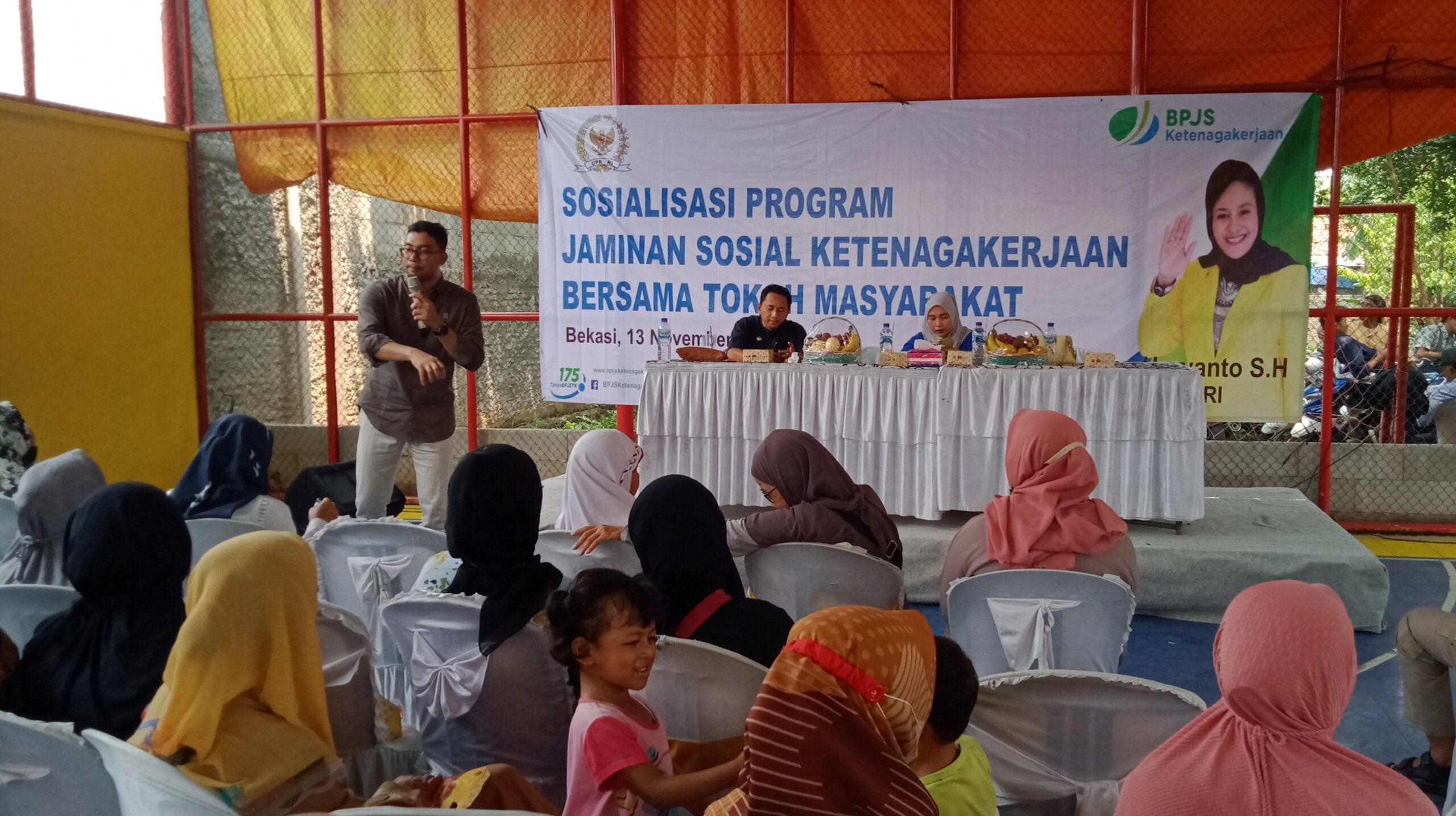 Santunan Jaminan Kematian sebesar Rp 45.565.880 ini diberikan secara simbolis oleh anggota Komisi IX DPR RI dari Fraksi Golkar Dra Hj Wenny Haryanto, SH didampingi Ahmad Bisri selaku Kepala Bidang Kepesertaan BPJS Ketenagakerjaan Cabang Bekasi Kota melalui kegiatan Sosialisasi Jaminan Sosial Ketenagakerjaan yang diikuti sekitar 300 warga Mustikajaya. Nampak hadir dalam kegiatan ini, yakni Ketua Kadin Indonesia Kota Bekasi Huda Sulistio dan tokoh perempuan Mustikajaya, Nurhayati, S.Pd yang juga mewakili pihak ahli waris.
