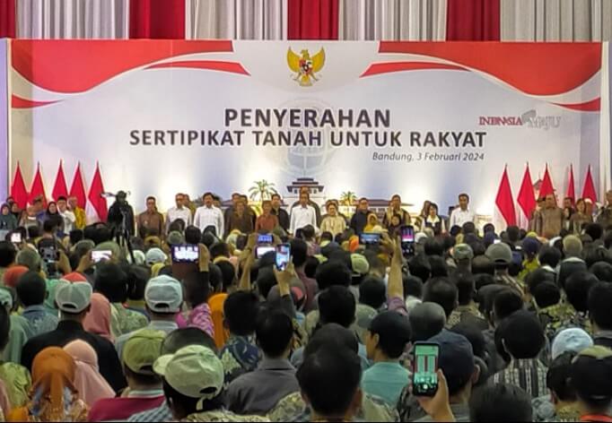 Presiden Joko Widodo didampingi Ibu Iriana Joko Widodo menyerahkan 3 ribu sertifikat hak atas tanah untuk rakyat yang digelar di Hall Gedung Indoor Si Jalak Harupat, Kabupaten Bandung, Sabtu (3/02).