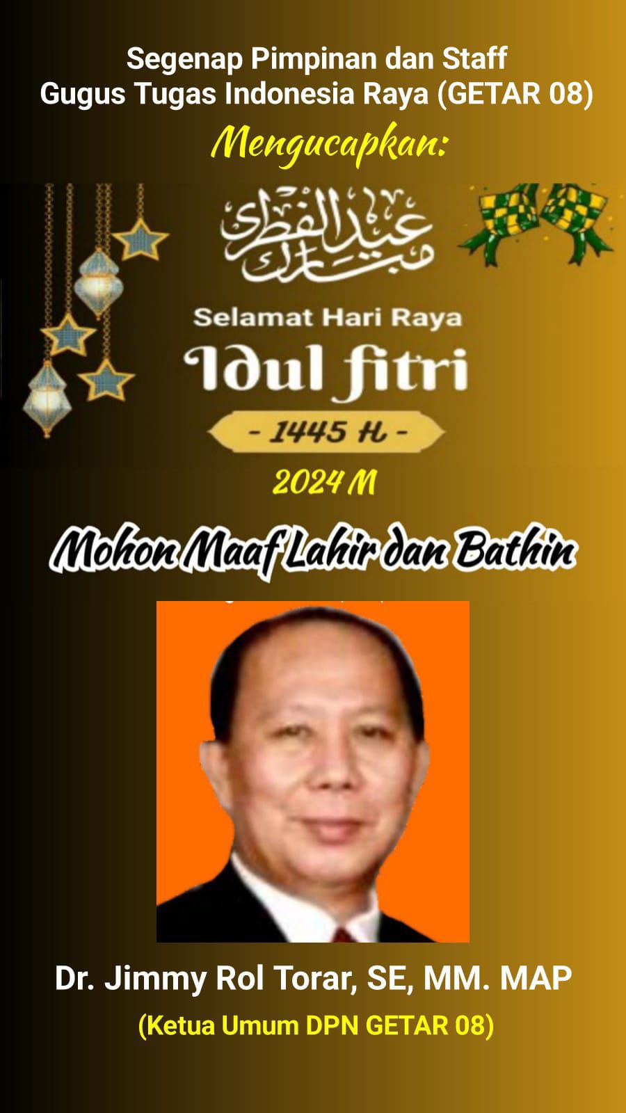 Ucapan Selamat Hari Raya Idul Fitri 1445 H / 2024 M dari Dr. Jimmy Rol Torar, SE, MM, MAP Ketua Dewan Pimpinan Nasional (DPN) Gugus Tugas Indonesia Raya (GETAR 08)