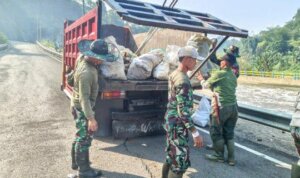 Pembersihan sampah dilakukan satgas sektor 8 sub 04 di kawasan terowongan kembar Desa Jelegong Kecamatan Kutawaringin.