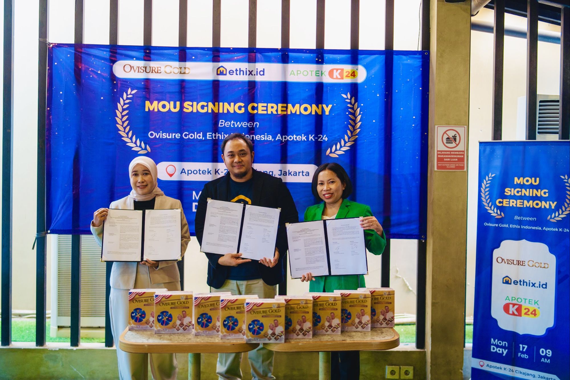 Jakarta – PT Ethix Niaga Teknologi (Ethix Indonesia), PT Bintang Emas Perdagangan Indonesia (Ovisure Gold), dan Apotek K-24 resmi menjalin kerja sama strategis yang ditandai dengan penandatanganan Nota Kesepahaman (MoU) di Apotek K-24 Cikajang, Jakarta Selatan, Senin (17 Februari 2025). Kolaborasi ini memastikan produk Ovisure Gold kini tersedia di seluruh jaringan Apotek K-24 di Indonesia, memberikan kemudahan akses serta jaminan keaslian bagi konsumen.