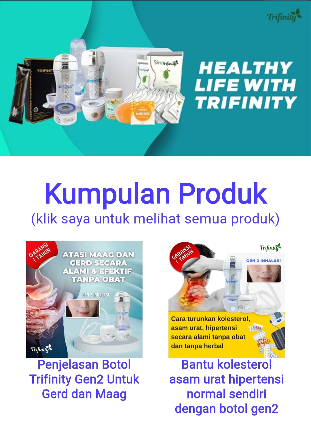 Produk Merek Trifinity menawarkan berbagai pilihan, mulai dari suplemen kesehatan hingga produk perawatan diri. Semua produk ini dirancang untuk memenuhi berbagai kebutuhan sehari-hari masyarakat, dengan fokus utama pada kualitas, keamanan, dan efektivitas. Oleh karena itu, tidak heran jika Trifinity telah diterima dengan baik oleh konsumen di Indonesia.
