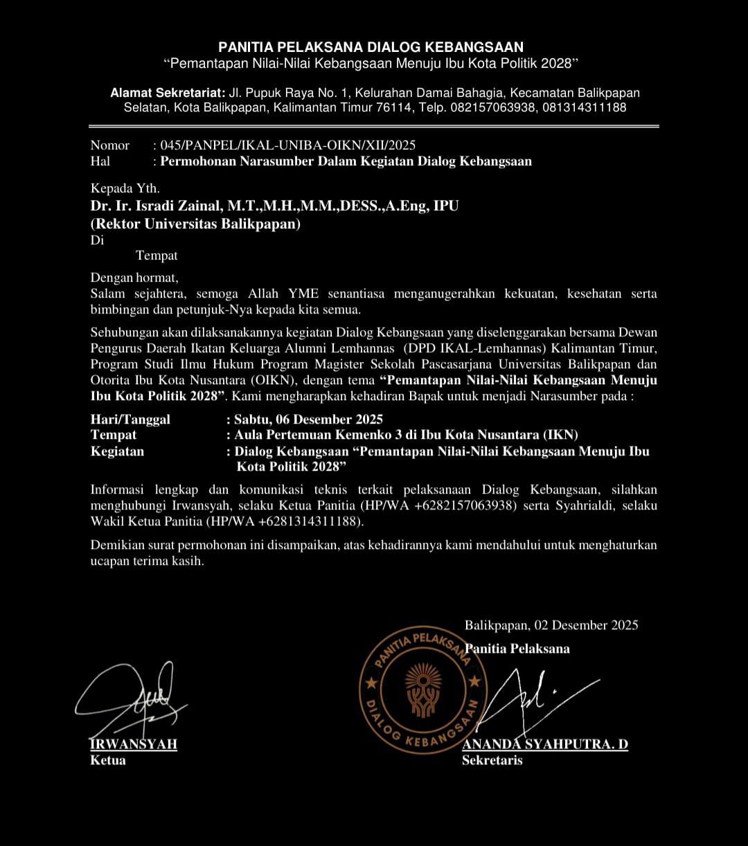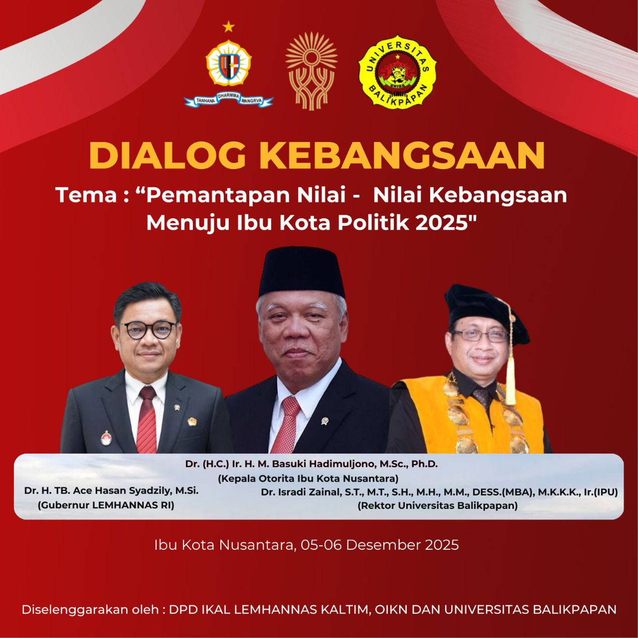 Jakarta – Dalam rangka memantapkan nilai-nilai kebangsaan menjelang penetapan Ibu Kota Negara (IKN) sebagai Ibu Kota Politik pada tahun 2028, Ikatan Alumni Lemhanas Kaltim bekerja sama dengan Magister Hukum Program Pascasarjana Universitas Balikpapan (Uniba) menyelenggarakan Dialog Kebangsaan. Acara berlangsung di ruang serbaguna Kemenko 3 IKN dan mengangkat tema “Pemantapan Nilai-Nilai Kebangsaan dan Dampak Pemindahan IKN sebagai Ibu Kota Politik”.