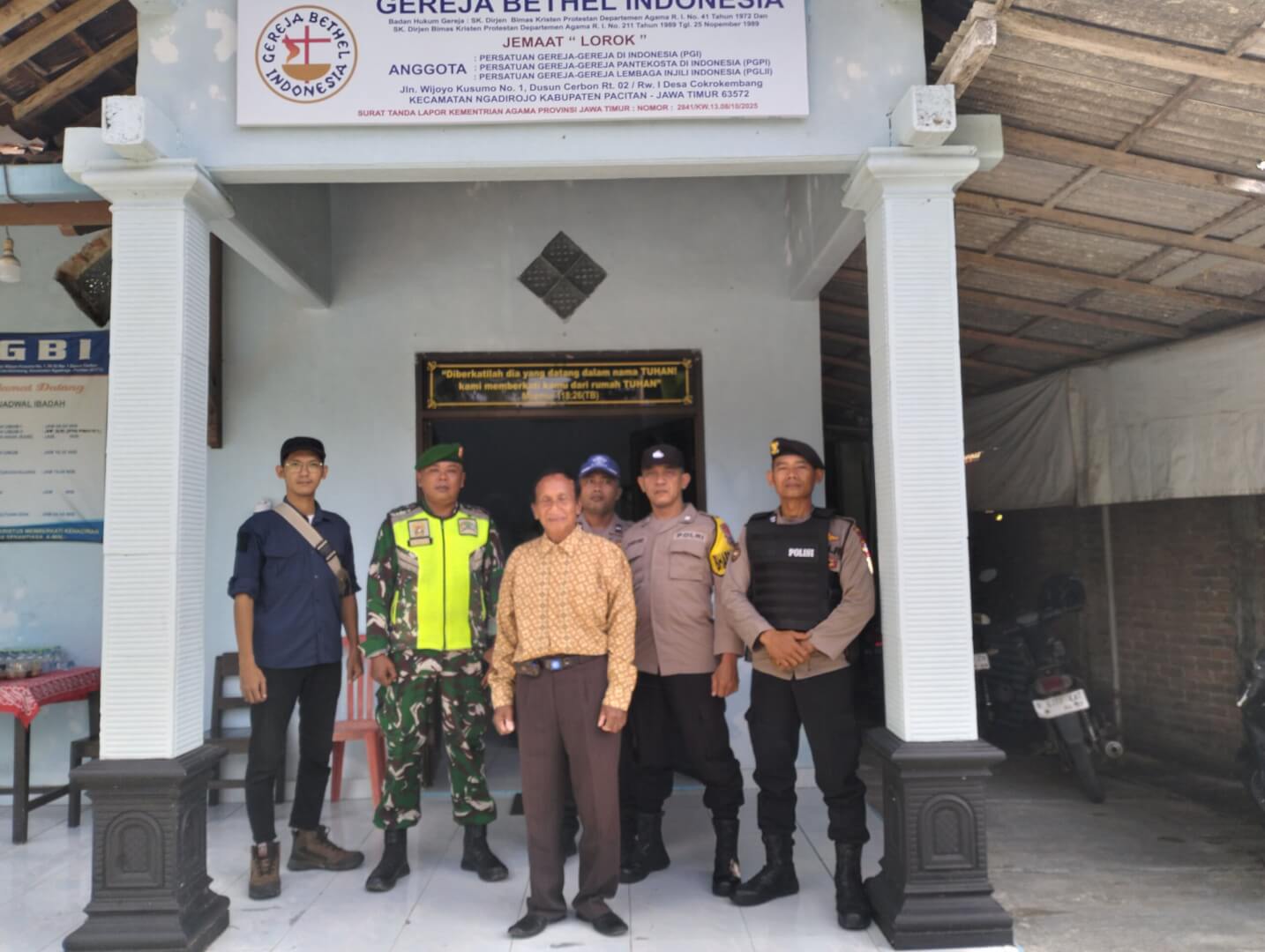 Pacitan – Dalam rangka mendukung kelancaran dan keamanan Perayaan Natal Tahun 2025, Babinsa Koramil 0801/07 Ngadirojo Kodim 0801/Pacitan, Sertu Sudianto, bersama satu orang rekan Babinsa, melaksanakan kegiatan pengamanan ibadah Natal di Gereja Bethel Indonesia (GBI) yang berlokasi di Jalan Wijaya Kusuma No. 1, Dusun Cerbon RT 002/RW 001, Desa Cokrokembang, Kecamatan Ngadirojo, Kabupaten Pacitan, Kamis (25/12/2025).