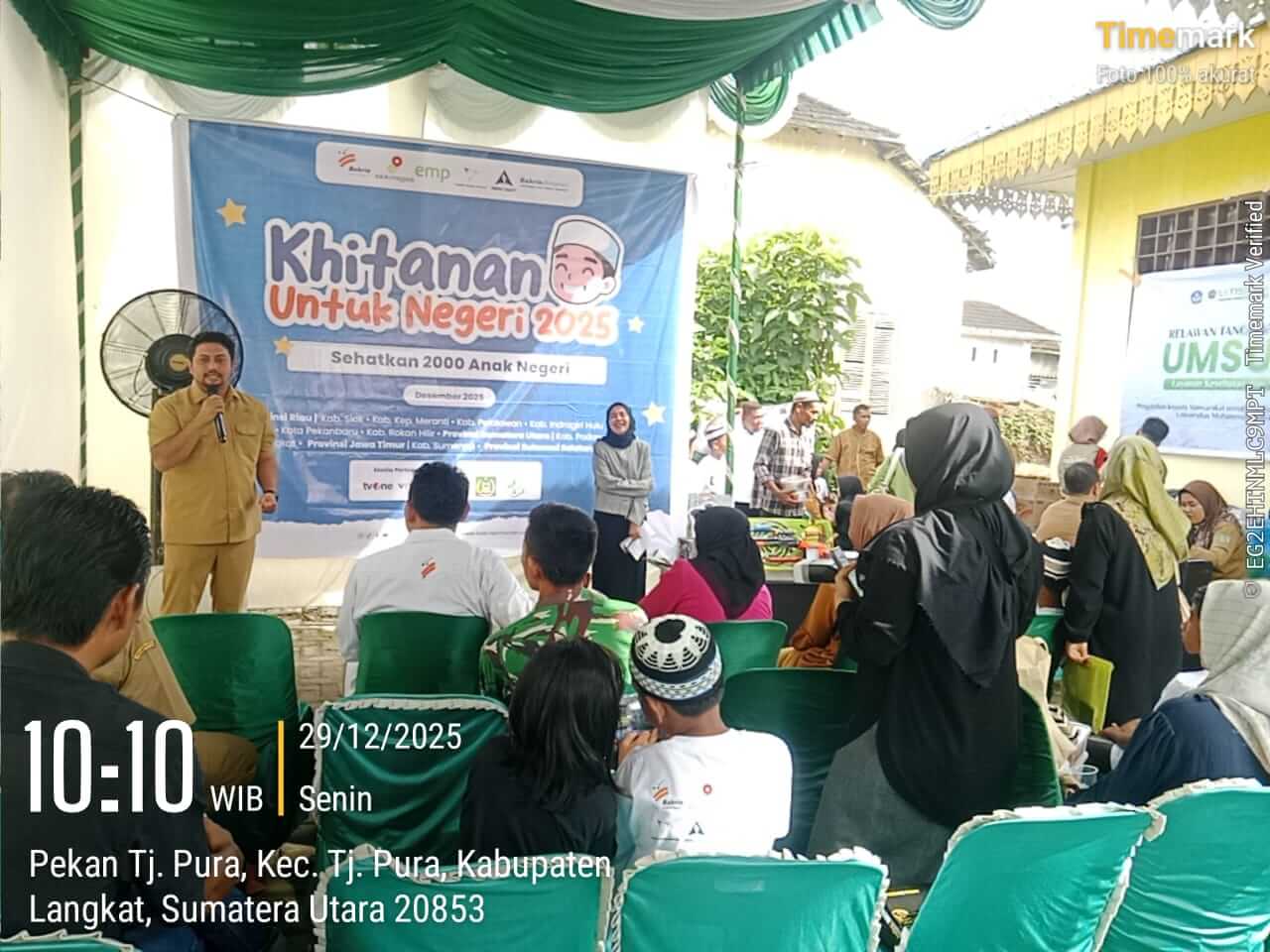 Mediapatriot.co.id | Langkat | Sumatera Utara | Berita Terkini – Kepedulian sosial dunia usaha kembali mendapat apresiasi luas dari masyarakat dan pemerintah daerah. Camat Tanjung Pura ” Tengku Reza Aditya .” menyampaikan penghargaan setinggi-tingginya kepada PT Energi Mega Persada (EMP) Gebang Limited bersama Bakrie Amanah atas terselenggaranya kegiatan Khitanan Massal Tahun 2025 bagi anak-anak negeri, khususnya masyarakat terdampak pasca bencana banjir di Kabupaten Langkat Aula kantor Camat Senin (29/12/2025)
