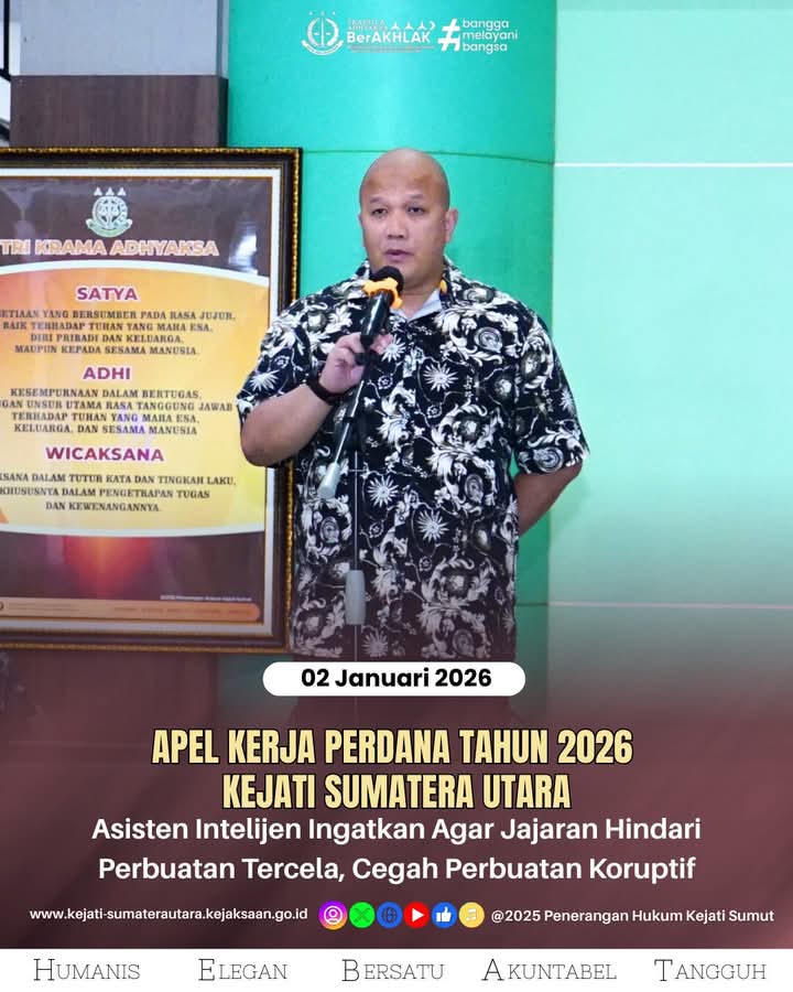 Penegasan tersebut disampaikan Irfan Wibowo saat memimpin apel kerja perdana Tahun 2026 yang berlangsung di Adhyaksa Hall Lantai I Kejaksaan Tinggi Sumatera Utara, Jumat (2/1/2026).