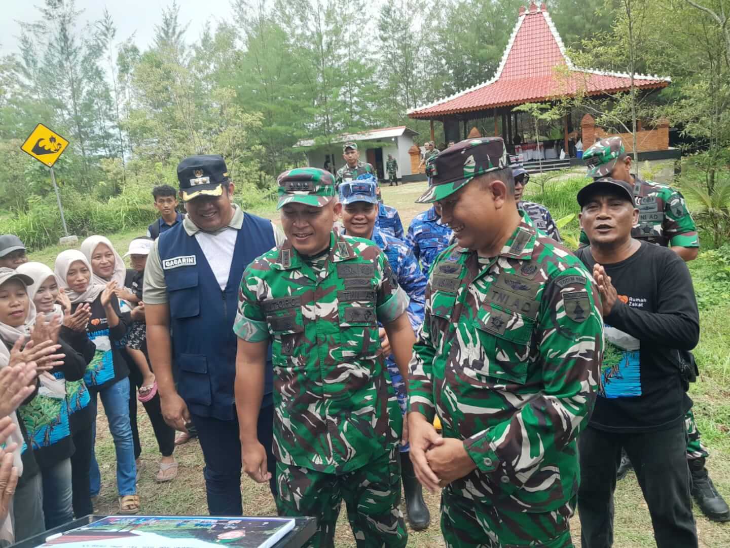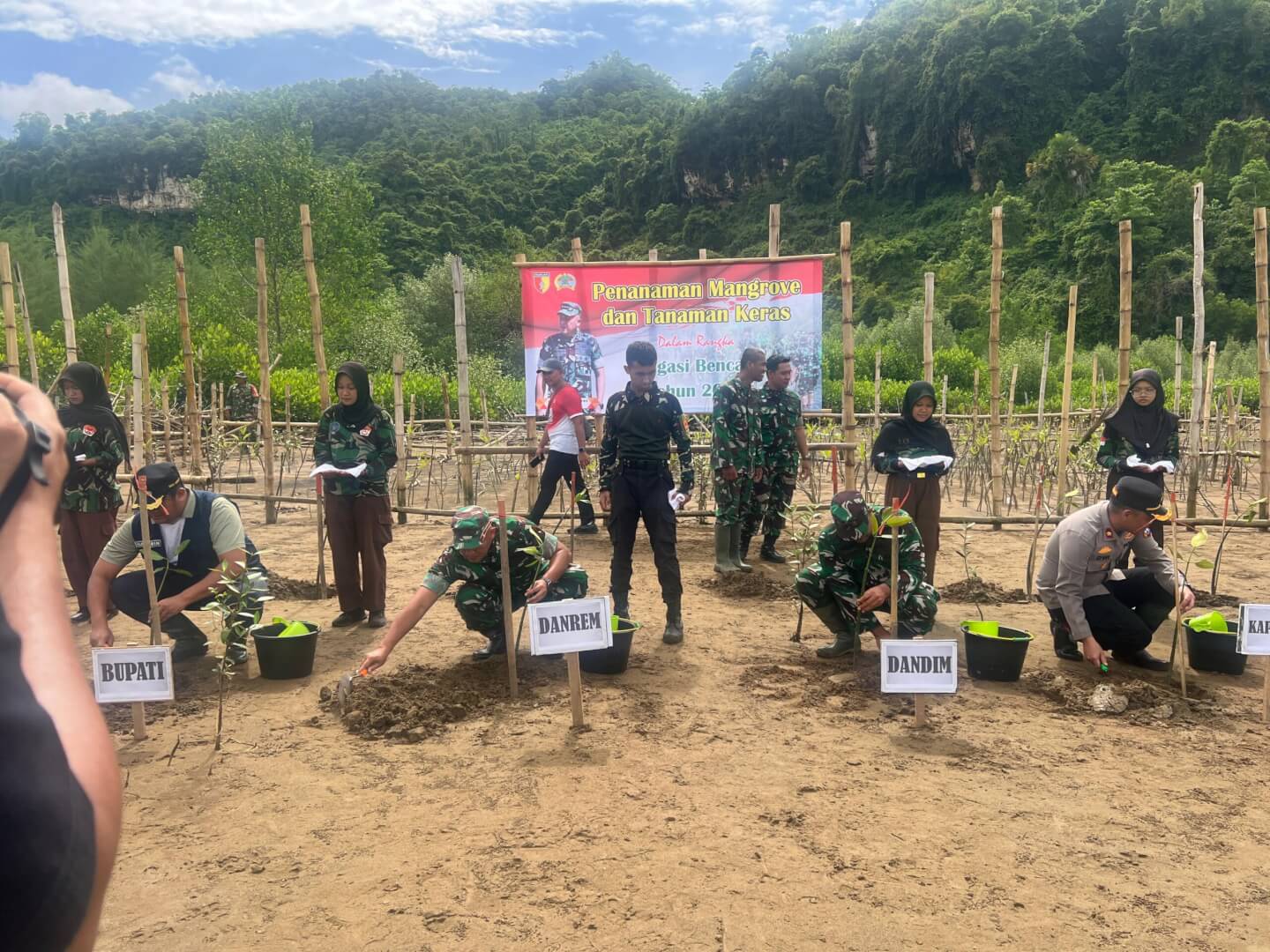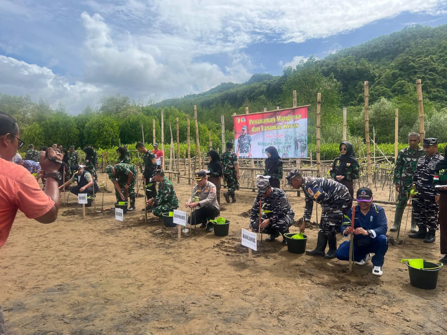 Kegiatan penanaman mangrove dan tanaman keras ini berlangsung dengan semangat gotong royong. Personel TNI, aparat pemerintah, serta masyarakat bahu-membahu menanam bibit di lokasi yang telah ditentukan sebagai wujud kepedulian bersama terhadap kelestarian lingkungan.