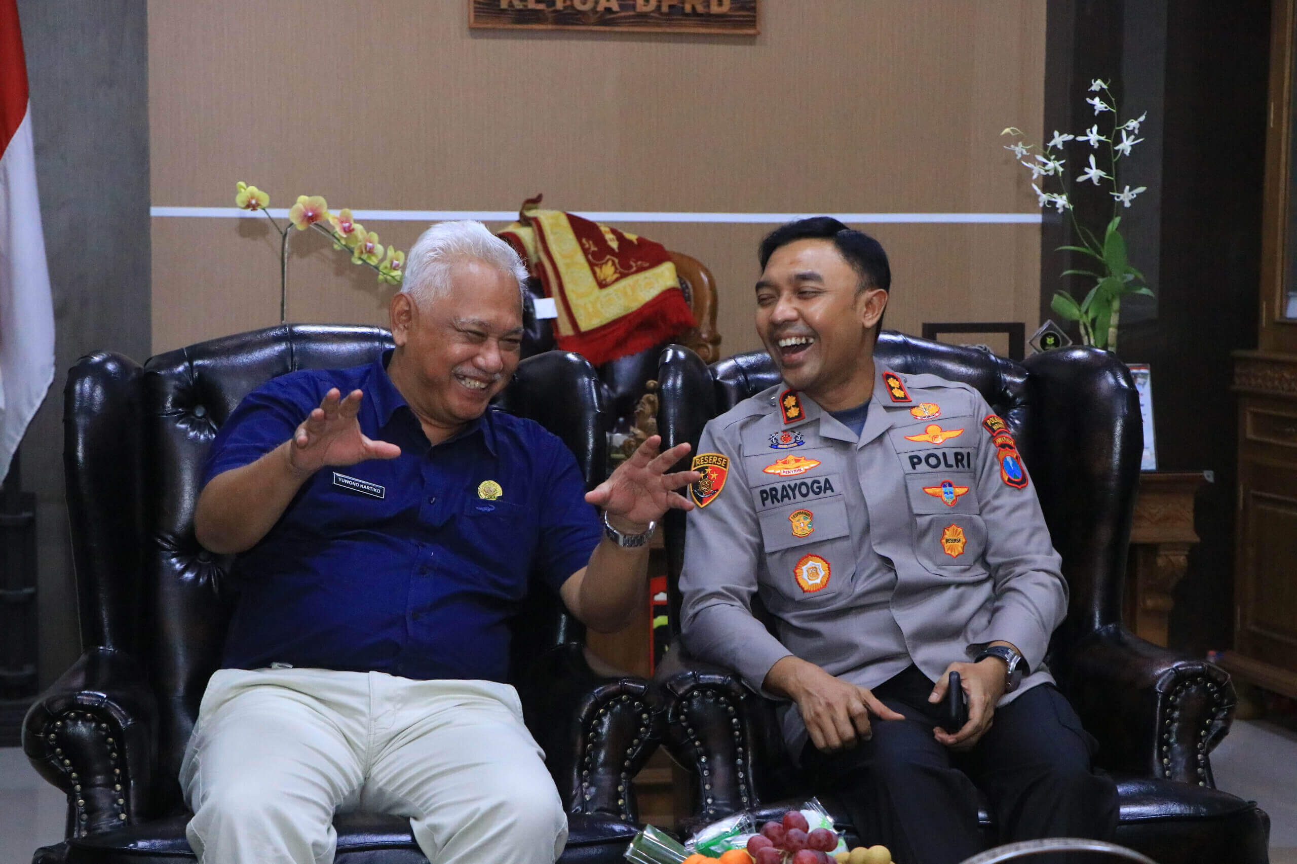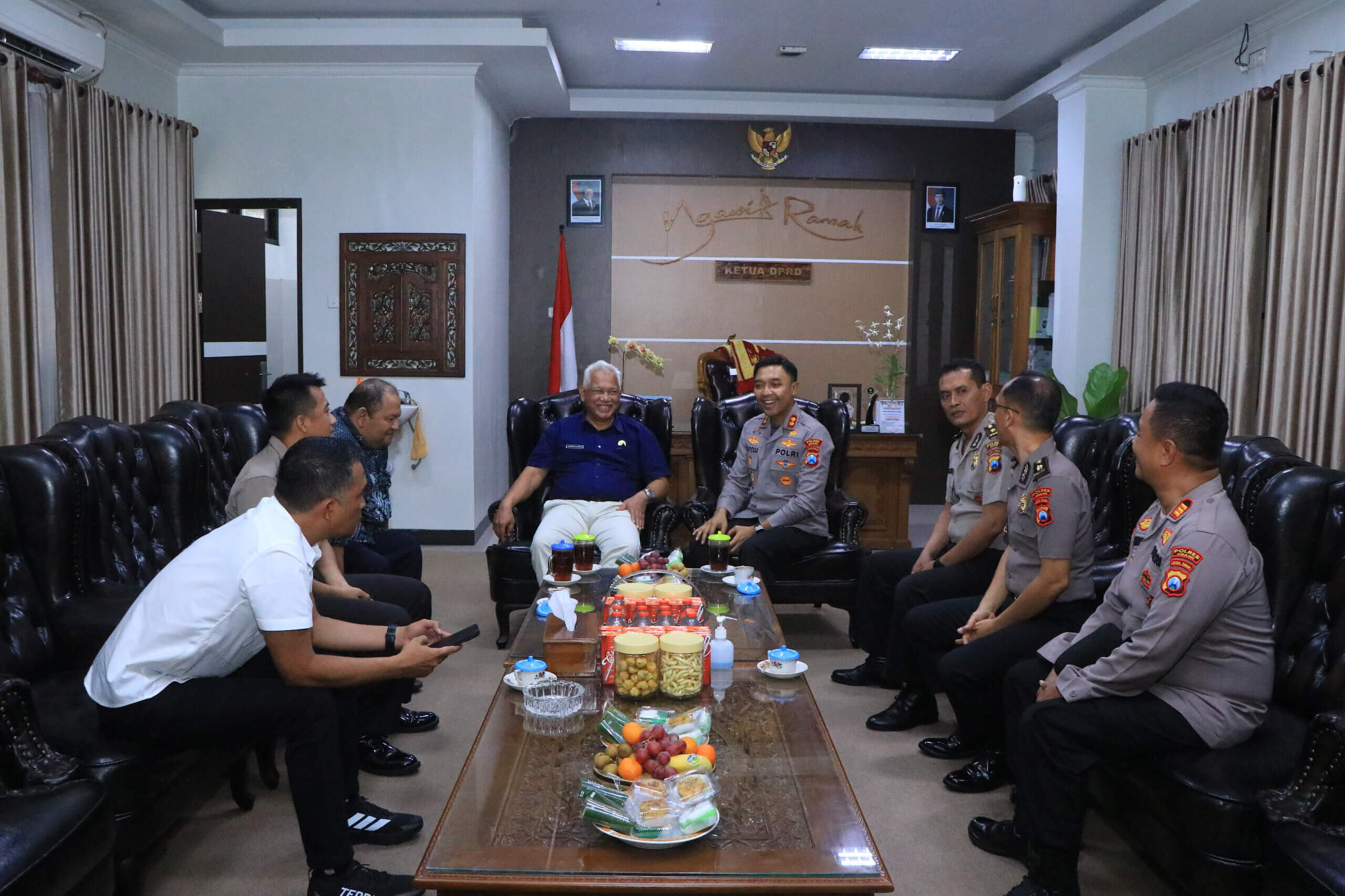 Kunjungan tersebut turut didampingi Wakapolres Ngawi Kompol Rizki Santoso, S.I.K., dan disambut langsung oleh Ketua DPRD Kabupaten Ngawi, Yuwono Kartiko, yang akrab disapa Pak King, di ruang kerjanya. Suasana pertemuan berlangsung hangat dan penuh keakraban.