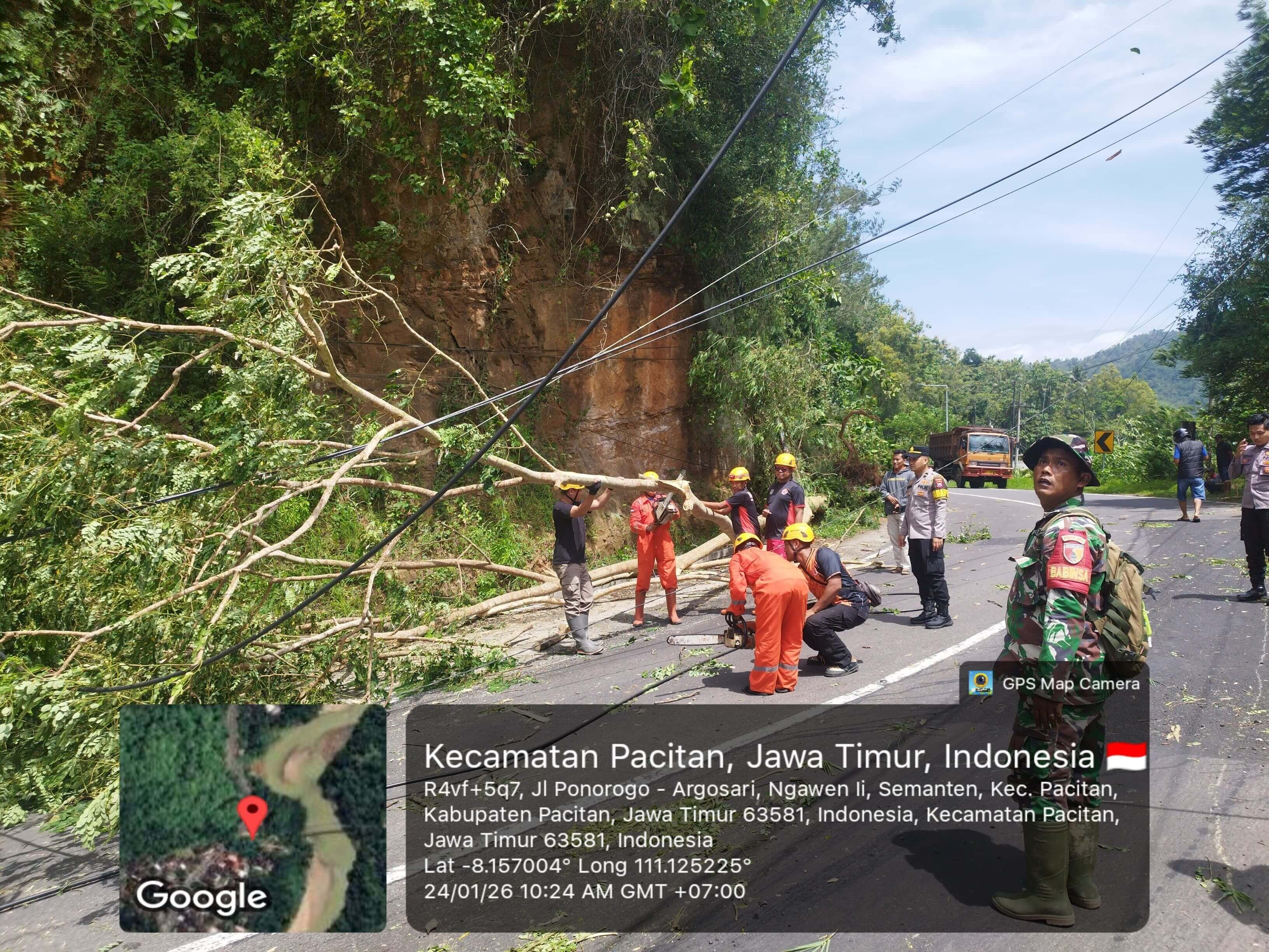 mediapatriot.co.id. Pacitan – Kolaborasi cepat antara TNI, Polri, BPBD Kabupaten Pacitan, PLN, serta masyarakat setempat berhasil mengevakuasi pohon besar dan tiang listrik yang tumbang hingga menutup akses jalan utama Pacitan–Ponorogo. Peristiwa tersebut terjadi di Dusun Blunding, Desa Semanten, Kecamatan Pacitan, Kabupaten Pacitan, Sabtu (24/1/2026).