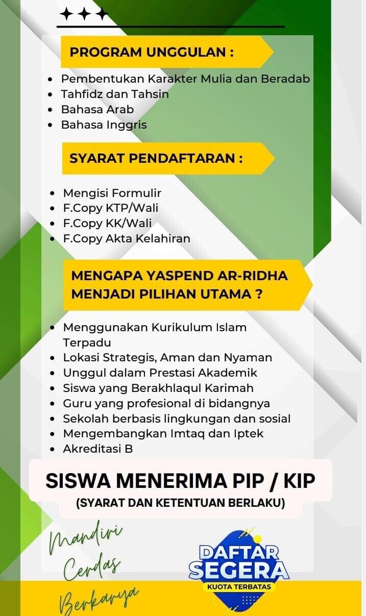 Yayasan Ar-Ridha mengajak para orang tua dan masyarakat untuk memanfaatkan kesempatan emas ini dengan mendaftarkan putra-putri mereka di SD IT dan SMP IT Ar-Ridha.