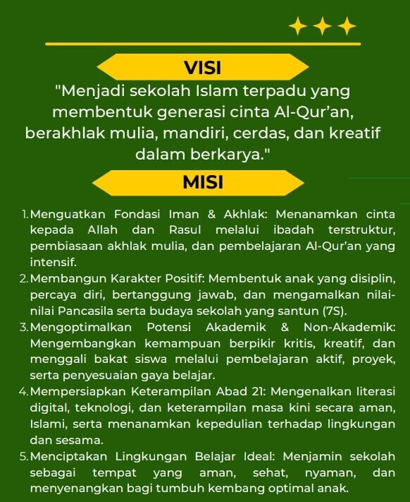 ”Visi ini diterjemahkan ke dalam misi strategis, antara lain penguatan fondasi iman dan akhlak, pembangunan karakter positif, optimalisasi potensi akademik dan non-akademik, penguasaan keterampilan abad 21 berbasis literasi digital, serta penciptaan lingkungan belajar yang aman, sehat, dan menyenangkan.
