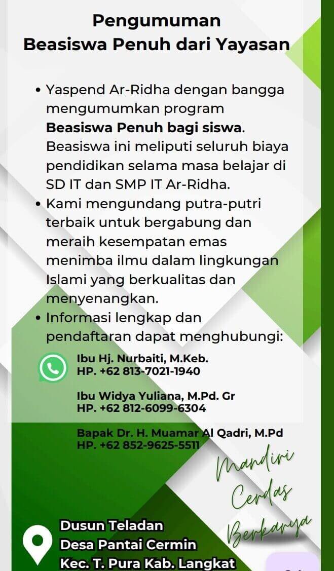 Yayasan Ar-Ridha mengajak para orang tua dan masyarakat untuk memanfaatkan kesempatan emas ini dengan mendaftarkan putra-putri mereka di SD IT dan SMP IT Ar-Ridha.